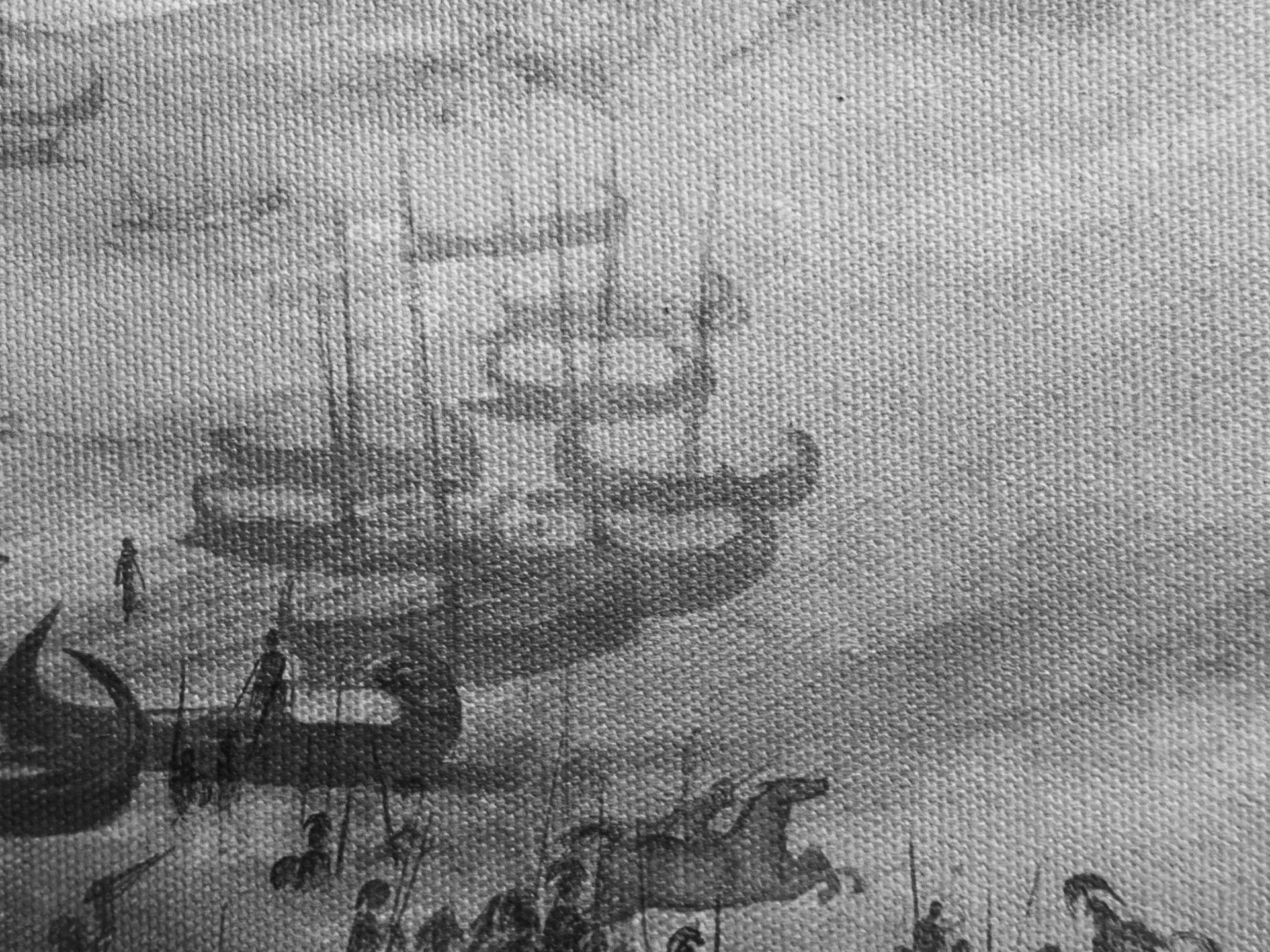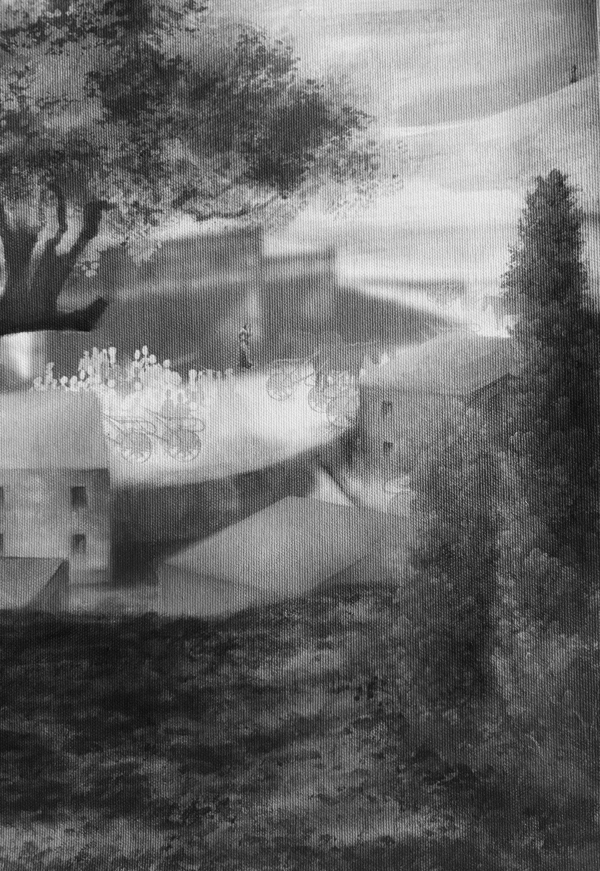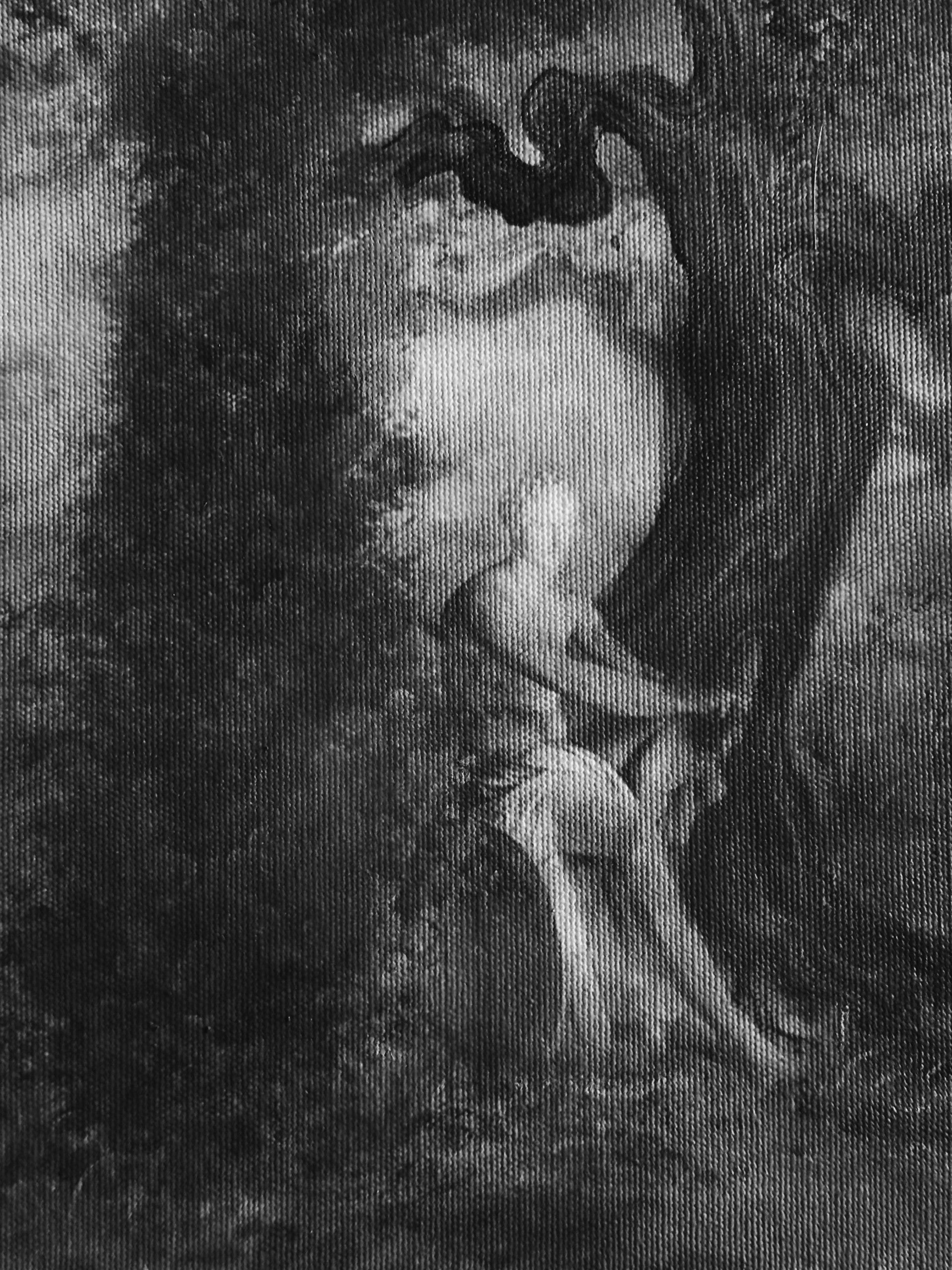 „Kassandra“ is a project about the character of the same name from Greek mythology. A variety of different artistic techniques were used, which, like the texts used and the artists inspired by, come from different millennia. Inspiration was drawn from paintings by Albert Bierstadt, Evelyn De Morgan, William Turner, Richard Wilson, Rembrandt van Rijn, Aert van der Neer, Caspar David Friedrich, Leonardo Da Vinci, Hieronymus Bosch and Pieter Bruegel, as well as from ancient greek artifacts and archeological sites. The underpainting of the painting shown here was painted digitally, then printed on canvas and afterwards thoroughly primed with clear gesso. Dozens of thin glazing layers were then painted over the underpainting before and after painting with un-thinned oil paints. To depict Kassandras visions as she experienced them living in all terrible moments of her life simultaneously - the composition had to distance itself from a traditional depiction of a real location.