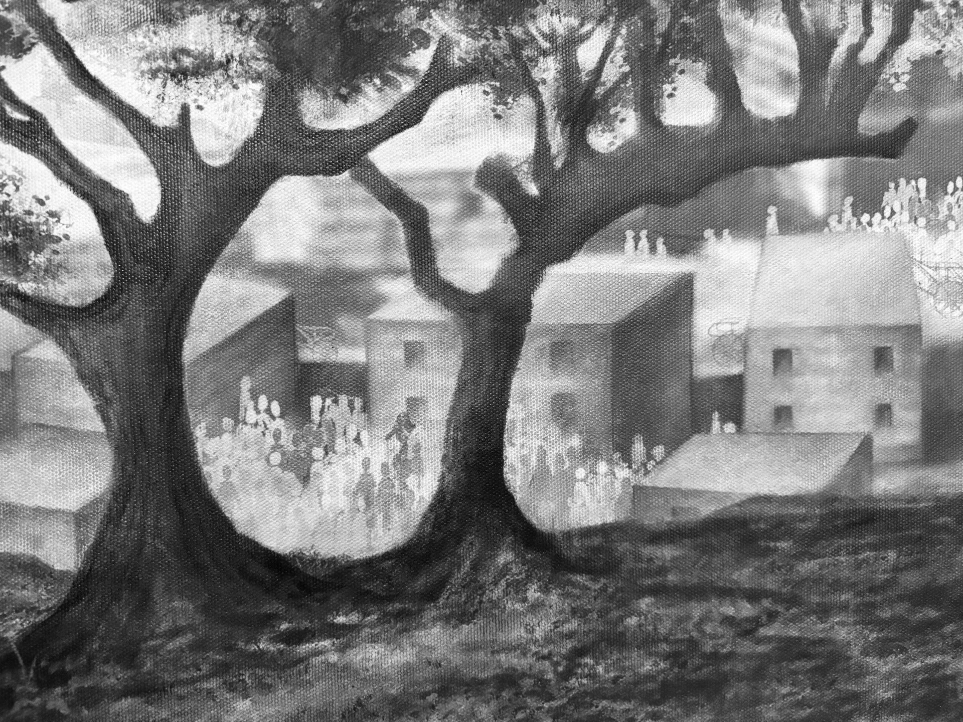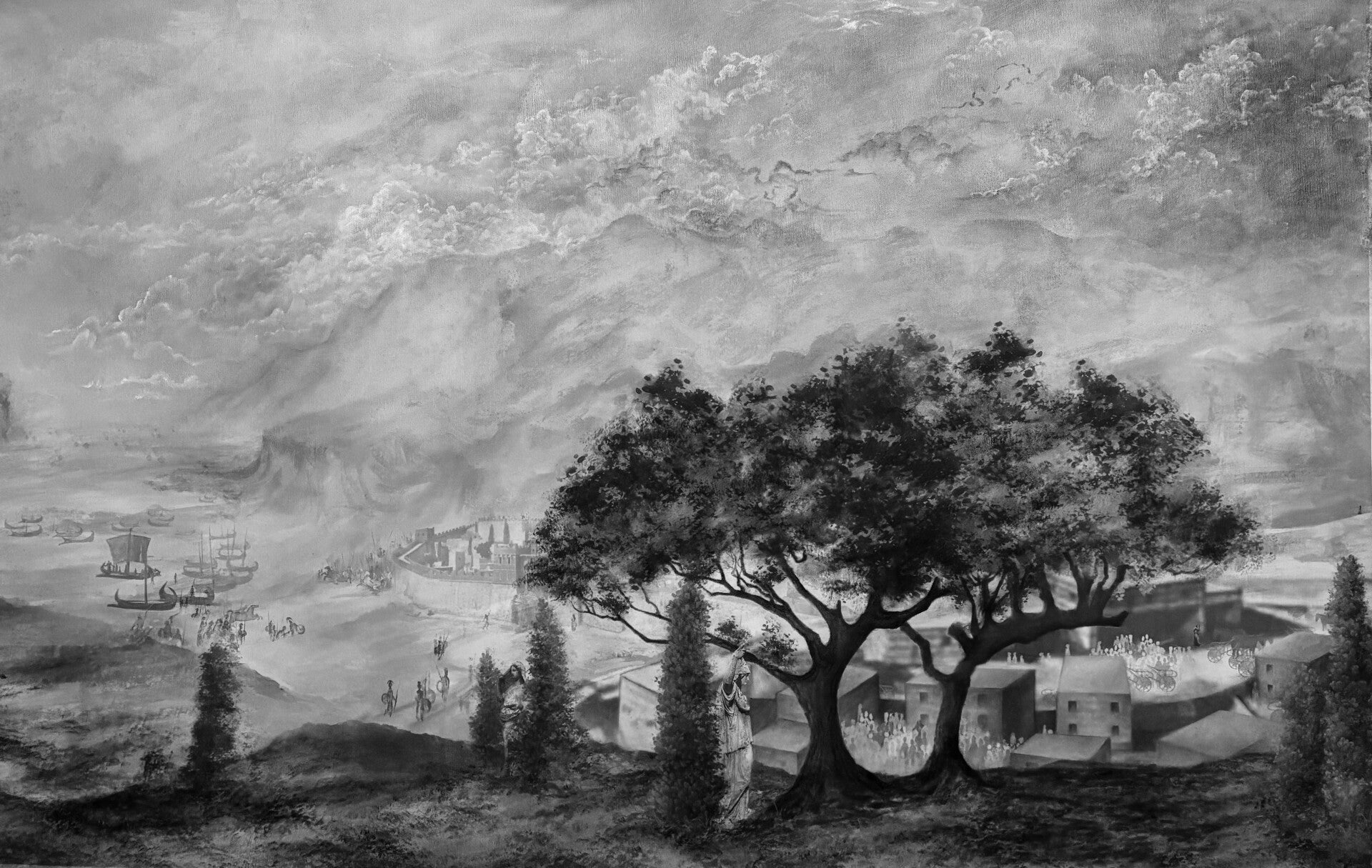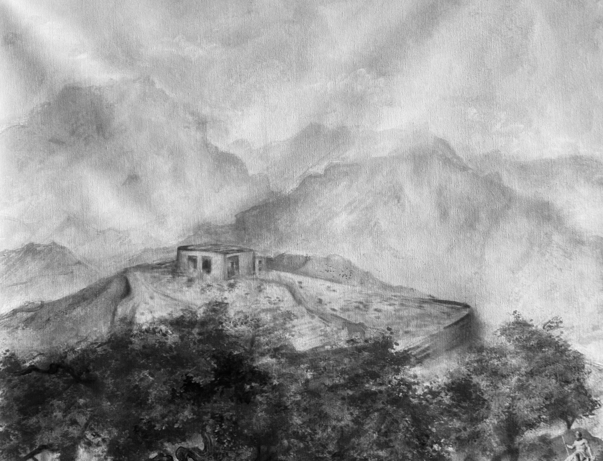 „Kassandra“ is a project about the character of the same name from Greek mythology. A variety of different artistic techniques were used, which, like the texts used and the artists inspired by, come from different millennia. Inspiration was drawn from paintings by Albert Bierstadt, Evelyn De Morgan, William Turner, Richard Wilson, Rembrandt van Rijn, Aert van der Neer, Caspar David Friedrich, Leonardo Da Vinci, Hieronymus Bosch and Pieter Bruegel, as well as from ancient greek artifacts and archeological sites. The underpainting of the painting shown here was painted digitally, then printed on canvas and afterwards thoroughly primed with clear gesso. Dozens of thin glazing layers were then painted over the underpainting before and after painting with un-thinned oil paints. To depict Kassandras visions as she experienced them living in all terrible moments of her life simultaneously - the composition had to distance itself from a traditional depiction of a real location.